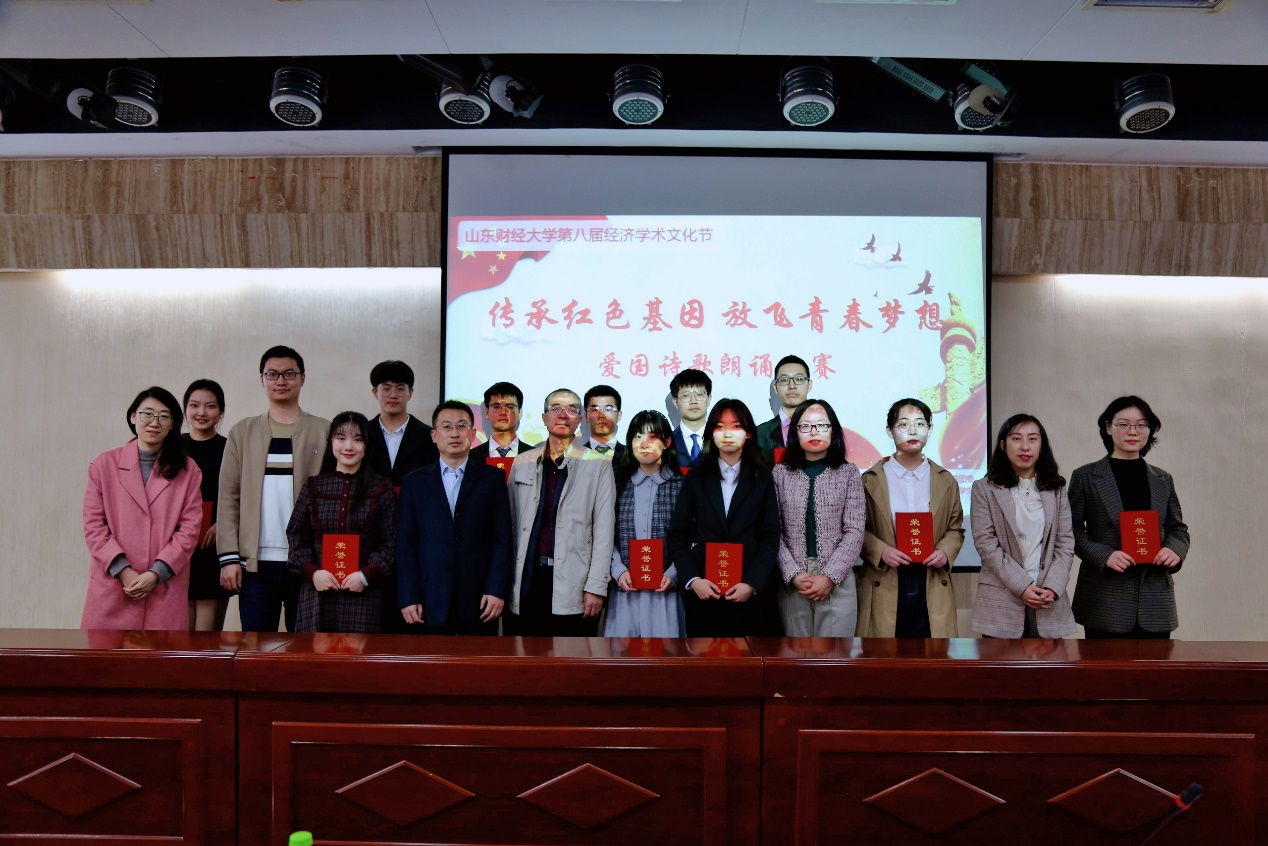 (通讯�: 王嘉� 刘毓�)为庆祝中国共产党建党100周年,激励学生继承和发扬党的光荣传统和优良作风�4�1日下午,校学生工作部、校团委、经济学院于圣井校区敏行楼联合举办山东财经大学第八届经济学术文化节之“传承红色基因,放飞青春梦想”爱国诗歌朗诵大赛。校党委宣传部副部长刘宝璋、校团委孙炯明老师、经济学院党委副书记高峰、李冰封担任评委,经济学院学工办主任裴斐、院团委书记付雯、院党委专职组织员王琦出席比赛,经济学院2019�2020级部分同学到场观看�