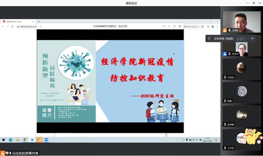 (通讯员:林安� 邢睿 唐玲玲)为认真落实学校加强疫情防控相关知识和技能培训要求,进一步做好疫情防控常态化工作,提高研究生疫情防控水平,保障学生健康安全和教学工作顺利开展,10�29日下午,经济学院组织全体研究生开展了新冠疫情防控知识教育活动。本次教育活动以各个班级为单位、各班班长为主持人,全体研究生参加。会议采取线上形式进行�