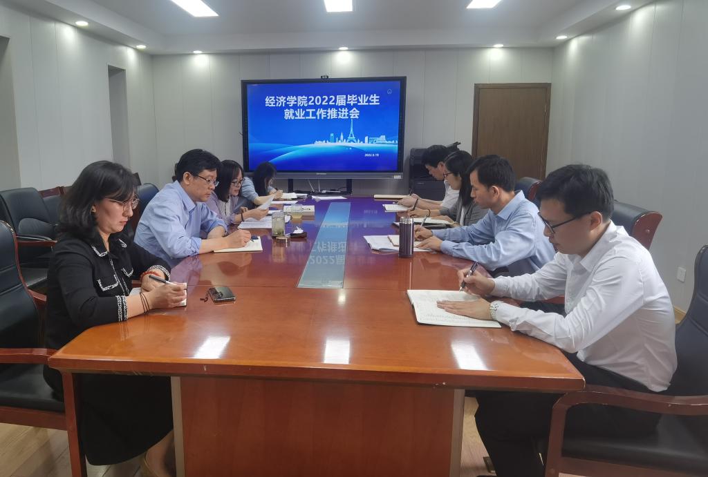 (通讯� 李冰封)为贯彻落实《山东财经大学关于进一步做�2022届毕业生就业工作的通知》,帮助毕业生树立正确的就业观、择业观,切实解决毕业生求职中的实际问题,进一步推进学院就业工作,5�19日,经济学院召开2022届毕业生就业工作推进会,党委书记姜伟、院长谢申祥、党委副书记李冰封、陈静,副院长崔宝敏、张明志,办公室主任马祥振、行政秘书王元、本科毕业班辅导员王琦参加会议�