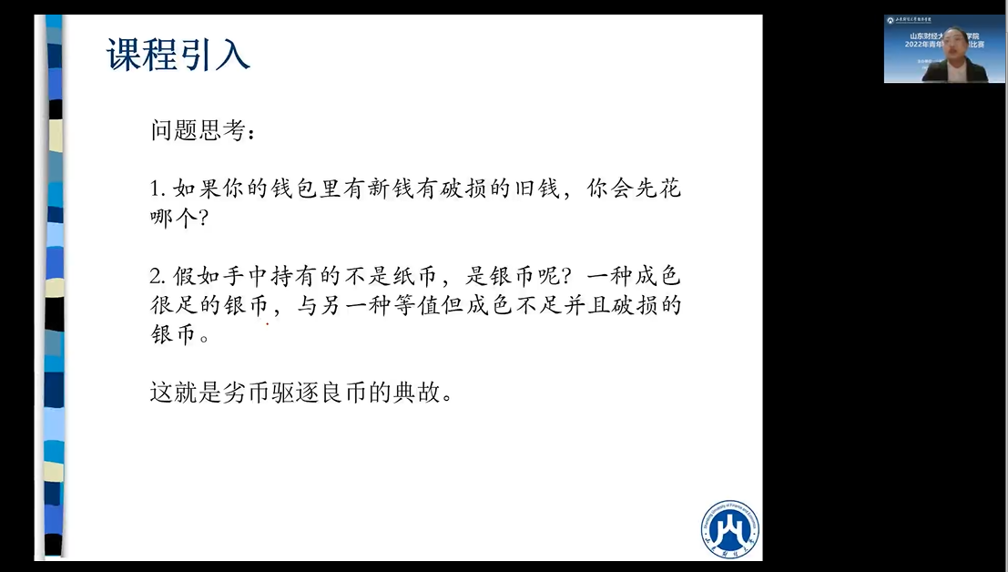 为加强经济学院青年教师队伍建设,引导青年教师进行教学改革创新,提高课堂教学质量水平,为青年教师搭建相互促进、共同提高的平台。经济学院于2022�11�24日晚通过线上方式举行�2022年度青年教师讲课比赛学院初赛。本次比赛共有朱维超�4名教师参加,最终参赛教师贾庆英获得特等奖,杨慧梅获得一等奖,朱维超、王琦珀获得二等奖�