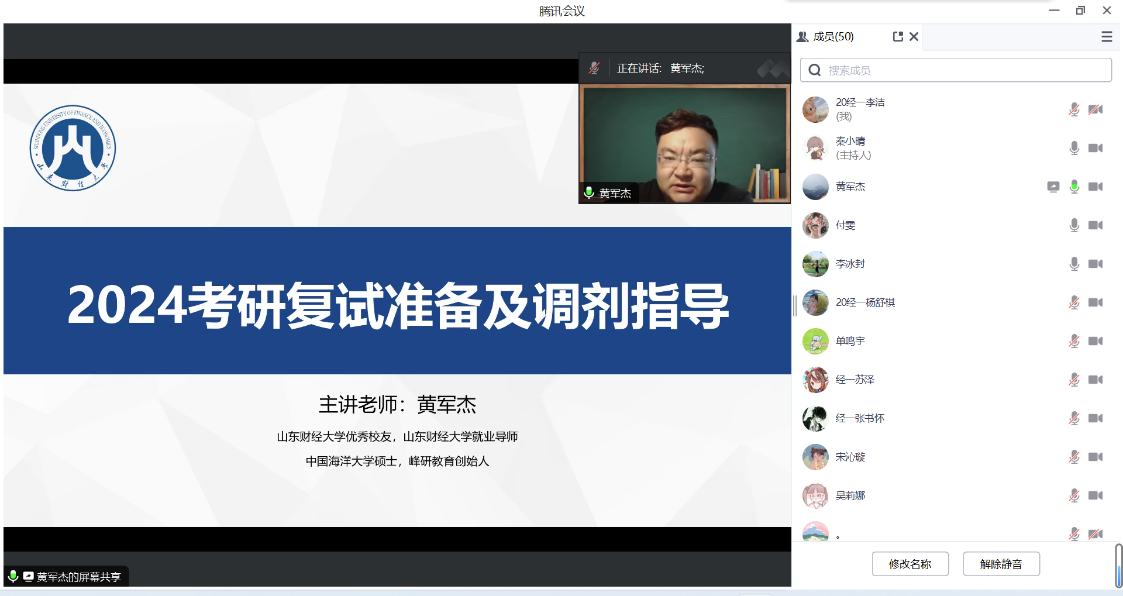黄军杰是山东财经大学就业导师、山东省教育发展委员会理事,有着十余年的考研规划指导经验。会议伊始,黄军杰对今年的考研难度和复试调剂形式进行了分析,主要围绕复试的重要性,复试的考察内容、复试前的准备及调剂的政策、调剂的注意事项、调剂平台、调剂具体操作等方面进行详细讲解;随后,针对考研调剂方面,黄军杰向同学们介绍了近几年来考研调剂详细情况,面对考研形势逐年愈发严峻以及就业难的背景下,他表示,同学们要根据成绩做出判断,在有限的时间内,通过校内校外信息渠道收集更多调剂信息,不要盲目二战,珍惜每一个升学机会;最后,黄军杰表示,欢迎同学们随时与他交流考研问题,一定会尽力为大家提供相关建议指引,帮助大家圆梦研究生�