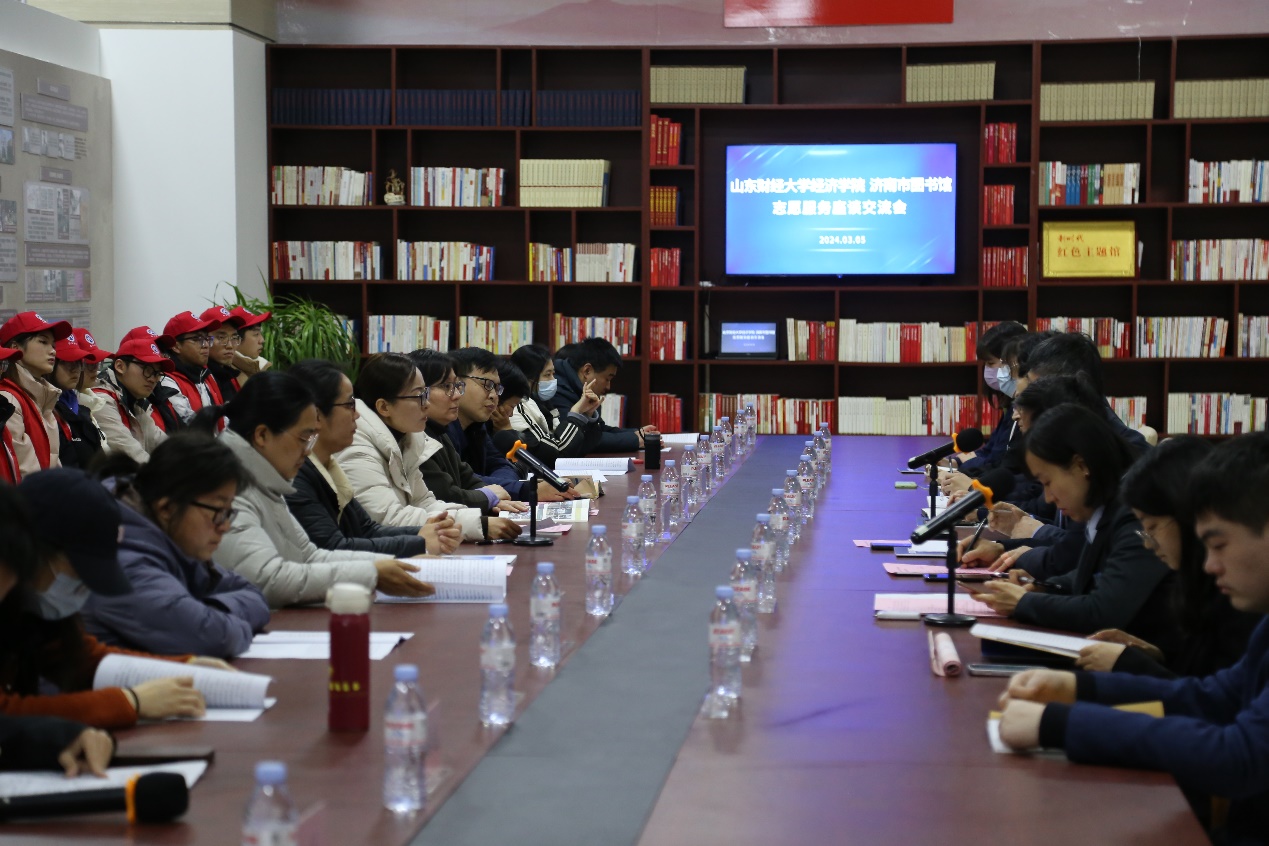 济南市图书馆副馆长尹延明、耿传水和青年馆员与经济学院师生一行在党史馆座谈交流。尹延明对山东财经大学经济学院老师及学生的到访表示热烈欢迎,介绍了济南市图书馆“一个思想指引”“两个工作抓手”“三个行业合作”“四个业务提升”“五个重点突破”工作体系,以及目前发展现状与未来规划,展现了济南市图书馆开放、进步、创新的精神风貌,希望未来在雷锋精神宣讲、践行志愿服务与社会实践方面与我院进一步加强合作,更好地发挥双方社会教育功能及人才、资源优势,努力促进双方交流,实现共赀�